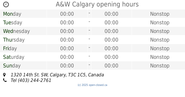 It is also possible to : Edit these OPENING HOURS of Restaurant A&W In Calgary, 1320 14th St. SW,
