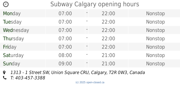 It is also possible to : Edit these OPENING HOURS of Restaurant Subway In Calgary, 1313 - 1 Street SW, Union Square CRU,